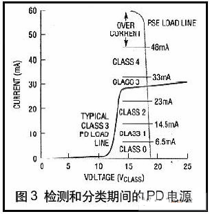 在允許PSE供電到線路前,必須檢查特征電阻。為了考慮有效特征,PD必須看似像與120nF或更小電容并聯的25KΩ±5%。PSE必須按受19KΩ~26.5KΩ較寬范圍的阻抗,這是基于系統中寄生串聯和并聯電阻的考慮。PSE必須拒收阻抗低于15KΩ或高于33KΩ以及跨接在終端大于10mF的負裁。
