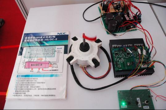 與展品同臺展出的還有一些應用方案,而其中最受矚目的是NEC Motor Driver帶霍爾傳感器的三相永磁同步電機180度正弦波驅動馬達方案,以及NEC的POWER LED 驅動IC方案。NEC馬達解決方案采用兩相變調技術,可以講開關效率降低30%,具有自動相位控制,逆風啟動等優勢,該方案參數簡單,可以適應不同馬達的不同系統,提供源代碼、硬件參考設計,還有世強的FAE提供現場技術支持。