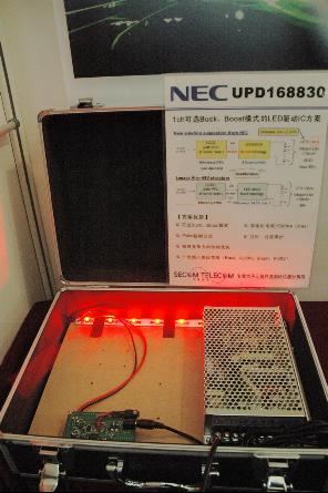 NEC的另外一款1ch可選Buck、Boost模式的LED驅動IC方案具有高輸出電流1500mA(max),PWM控制方式,過壓、過流保護,極具競爭力的價格優勢和極廣的輸入電壓范圍(Buck:9-38V;Boost:9-28V)等優勢,在現場大受關注。