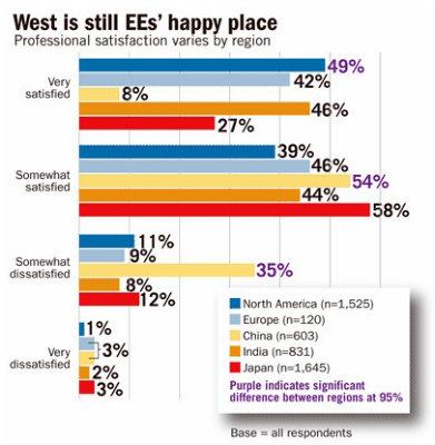 而除了對較長的工時(通常每周超過40小時,在日本與印度甚至超過50小時)、基層員工等級有所抱怨,以及對就業保障、失業補償等議題日益升高的憂慮,工程師們也對職業的未來發展前景與成長機會看法樂觀。