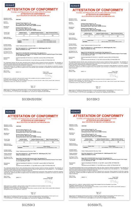 為此,陽光電源成立了項目組,對原有產品進行了升級改進,并選擇了意大利最著名的測試機構—EuroTest實驗室,他們嚴格按照DK5940標準的要求,對陽光電源的SG30K3、SG50K3、SG100K3、SG250K3、SG500KTL等光伏并網逆變器進行了多項性能測試,特別是進行了在高溫(環境溫度55℃)、高濕(相對濕度93%)下的嚴酷測試。測試結果表明陽光電源逆變器表現優異,完全滿足DK5940標準的各項要求,順利拿到了認證證書,為陽光電源的產品進入意大利市場鋪平了道路。