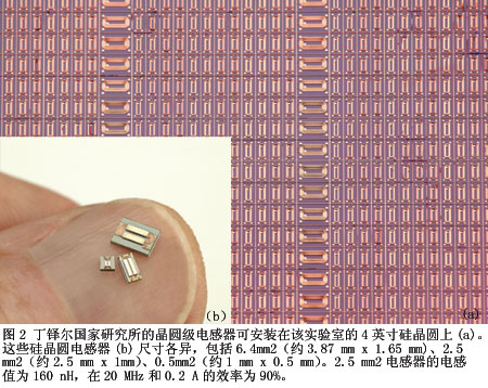 愛爾蘭考克大學的丁鐸爾國家研究所是最有經驗的晶圓級磁性元件研究中心之一,它利用其4英寸晶圓加工線來研究開關頻率為10 MHz至100 MHz的電感器(圖2a)。這些電感器使用“跑道式”幾何結構的電鍍銅繞組,后者被封裝在一種薄膜電鍍密封鎳鐵軟磁芯中(參考文獻2)。為了提供參考,丁鐸爾的研究人員用一塊單片MOSFET及驅動器傳動系IC演示了工作于15 MHz至65 MHz的電感器。這種降壓轉換器SMPS(開關式電源)包含轉換器和電感器,在20 MHz時的效率為80%,使用了Coilcraft公司(www.coilcraft.com)的商用貼片電感器,并且輸入電壓為3V,輸出電壓為1.5V,輸出電流為100 mA。當研究人員替換了Tyndall 2.5 mm2微電感器之后,效率降至76%。但請記住:Tyndall電感器不是為該電路設計的,它本是某種生產設計的一部分。Mathúna表示,研究人員可以調整銅損耗和磁芯損耗。他說:“我們把銅繞組電鍍到模具中,厚度為35 m至50 ?m。如果我們增加銅的厚度,我們就能在很大程度上仿真Coilcraft電感器。另外,磁芯材料有自己的內在損耗。在鍍于薄膜的磁性材料中,電阻系數將會很低,即這些材料將會具有很強的導電能力。例如,某種鎳鐵材料的電阻系數約為45 Ωcm。如果我們改用另一種系數接近100 至150 Ωcm的磁性材料,我們就能降低渦流損耗。”
