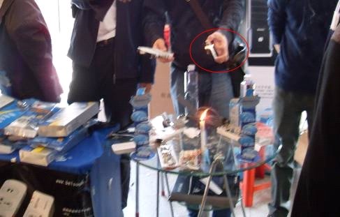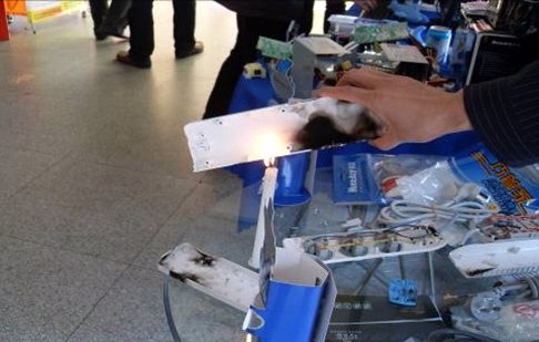 現場演示火燒排插,旁邊桌上放著從市場上買來的劣質排插