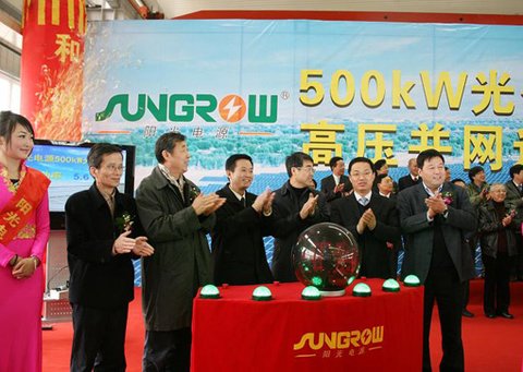 3月1日上午,在陽光電源公司產業基地,陽光電源自主建設的500kWp光伏電站成功并網發電,成為我國中部地區建成發電的最大光伏電站。國家發改委、科技部、工信部、中國可再生能源學會的領導,省科技廳廳長徐根應,省發改委總工程師朱也牧、副市長楊增權、政協副主席盛志剛,國內可再生能源行業眾多主力企業—大唐集團、華電集團、中廣核風電、申能新能源、尚德電力、賽維LDK等企業的專家領導以及來自歐洲、日本、韓國的客人等近300位中外嘉賓共同出席并見證了電站的并網發電儀式。