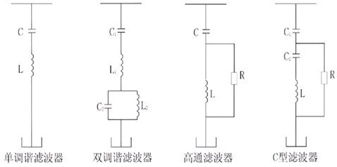 無源濾波器主要由濾波電容器、濾波電抗器等適當(dāng)組合成LC濾波裝置。LC濾波裝置主要有單調(diào)諧濾波器、雙調(diào)諧濾波器、高通濾波器、C型濾波器等。各種濾波器電氣接線如下圖。