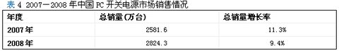2007年,中國開關(guān)電源市場保持穩(wěn)定增長,總體銷售量為2081.6萬臺(tái)。2008年P(guān)C開關(guān)銷量2824.3萬臺(tái),增長率為9.4%。