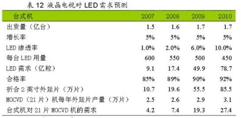 液晶電視和臺式電腦顯示器為LED 的大尺寸面板應用助力液晶電視方面,根據iSupply 在2007 年底的統計,2007 年LED 背光源液晶電視的出貨量是100 萬臺,而2007 年液晶電視的出貨量是7800萬臺,滲透率不到2%。隨著LED 技術的進步和成本的下降,預計未來滲透率會不斷提高。Displaybank 最近預測2010 年液晶電視的LED滲透率將達到6.4%,2011 年和2012 年出貨量有望達到2500 萬和5000 萬臺。我們認為Displaybank 對2010 年滲透率的估計過于保守,我們認為滲透率在9%。