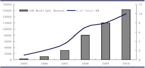 LED背光模組也是未來LED應用的一個巨大市場,隨著LED背光模組價格的持續下滑,其價格將逐漸降至可接受范圍內,并最終對CCFL產生明顯的替代。