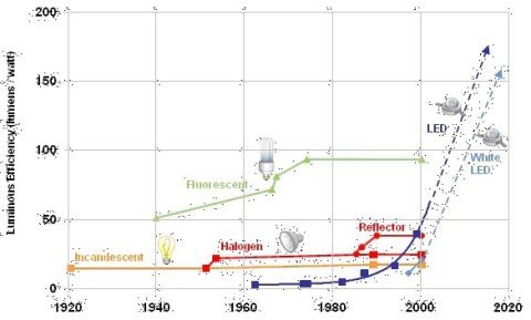 在美國,約三分之一的一次能源用于發電,而電力的20%又用于照明,假設目前照明市場中白熾燈、熒光燈和高壓氣體放電燈的市場比例分別是42%、41%、17%,則合計的照明效率約在45-65lm/W。如果LED照明的發光效率能達到150-200lm/W的目標,并且全部取代傳統照明,則合計的照明效率可以提高一倍以上,美國用于照明的電力消耗因此將減少一半,全部電力消耗將減少超過十分之一。預計到2025年美國每年的電力消耗大約是52500億度,以每度電零售價格0.07美元計算,消費者每年大約支付3500億美元,因此使用LED照明每年可以節約用電5250億度,消費者每年可以節約350億美元。而對全球來說,這個數字將擴大3到4倍。美國一座核電站的年均發電量大約是720億度(按每座1GW的發電容量,每年發電時間為365×24小時,發電小時利用率87%計算),節約5250 億度意味著節約大約70座核電站的年發電量。