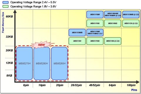 近年來,亞洲市場上的小家電應(yīng)用產(chǎn)品對(duì)低管腳8位微控制器的需求急劇上升。為應(yīng)對(duì)這些需求,富士通微電子在其F2MC-8FX家族中推出了低管腳8位閃存微控制器。為滿足更大的需求,富士通微電子此次推出全新的三個(gè)系列MB95260H、MB95270H和MB95280H,并首次在8位微控制器中增加了嵌入式雙操作閃存。雙操作閃存不僅能為程序數(shù)據(jù)提供存儲(chǔ)器,也能為數(shù)據(jù)存儲(chǔ)提供存儲(chǔ)區(qū)(可取代外部E2PROM),從而降低了整體系統(tǒng)成本。此外,此款雙操作閃存具備業(yè)界領(lǐng)先的高達(dá)10萬次的擦寫次數(shù)。