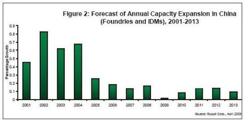 圖2所示為iSuppli公司對(duì)于2001-2013年中國(guó)半導(dǎo)體工廠產(chǎn)能的逐年預(yù)測(cè),包括晶圓代工與集成設(shè)備制造商(IDM)在內(nèi)。
