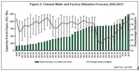 圖3所示為iSuppli公司對(duì)于2000-2013年中國(guó)晶圓與工廠產(chǎn)能利用率的預(yù)測(cè)。