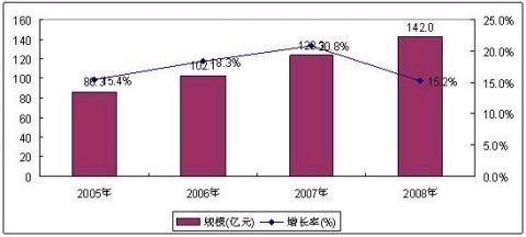 圖1 2006-2008年中國機房產(chǎn)品市場規(guī)模與增長狀況