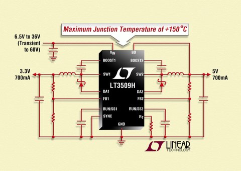 近日,凌力爾特公司(Linear Technology Corporation)推出LT3509的H級新型號。該器件是一款雙輸出、電流模式脈寬調(diào)制(PWM)的降壓型DC/DC轉(zhuǎn)換器,采用MSOP-16E封裝,帶有兩個內(nèi)部36V、1A電源開關。該H級型號經(jīng)過測試,并保證150℃的最大結(jié)溫,而E級與I級型號的最大結(jié)溫為125℃。E級、I級和H級型號的所有電氣規(guī)格完全相同。LT3509的H級版本是要求高環(huán)境溫度的汽車和工業(yè)應用之理想選擇。