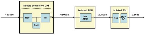 圖中所示是典型的美國數據中心所使用的功率傳輸鏈路。首先,交流電輸入到不間斷電源(UPS),一般相間電壓為480V,相電壓為277V。UPS輸出到電源分配單元 (PDU)的電壓和輸入相同,而PDU包括電源斷路器以及將輸入電壓降壓到208V的變壓器。服務器的供電單元(PSU)將208V輸入變換為12V直流。