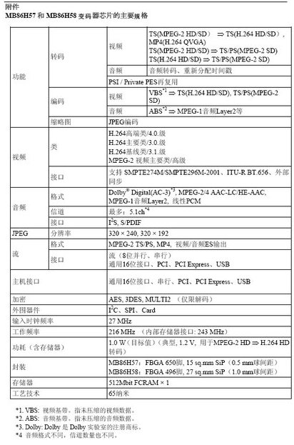 這些變碼器在單一芯片上集成了音頻轉碼功能、保護數字內容版權管理的加密功能、解調器接口及封裝內存儲器。MB86H57變碼器的封裝為15mm × 15mm,適合在小巧緊湊型電子設備上添加視頻錄制功能。因此,這些芯片不僅可以用于非移動類固定電子設備,也能夠擴大筆記本電腦等移動類產品的錄制功能。