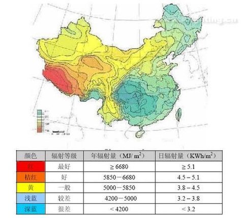 由于中國的地理位置,中國擁有非常可觀的太陽能源。全國各地的年太陽輻射總量為3340-8400MJ/m2,中值為5852MJ/m2。從全國太陽年輻射總量的分布來看,青藏高原和西北地區(qū)、華北地區(qū)、東北大部以及云南、廣東、海南等部分低緯度地帶的年太陽輻射總量都在5000MJ/m2以上,是我國太陽能資源豐富或較豐富的地區(qū)。而長江流流域及四川、貴州等東、中部地區(qū)的太陽能資源條件較差,年太陽輻射總量在5000MJ/m2以下。