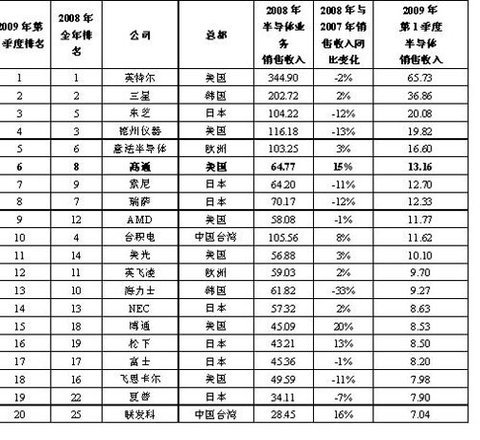 據IC Insight最新的研究公報,去年躋身前10位的首家無晶圓廠芯片供應商高通公司在2008年第四季度排名第8位后今年第一季度排名再次上升,現居第6位。