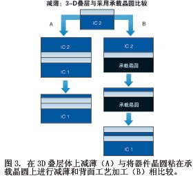 大多數3DIC工藝中,單個IC的厚度都遠低于75μm。減薄器件晶圓有兩種選擇(圖3)。在工藝A中,晶圓2以正面朝下的方式直接與IC疊層鍵合在一起。該晶圓接著被減薄到所需厚度,可能將TSV的背端露出。背面工藝順序刻蝕出通孔(如果沒在晶圓加工廠中實現的話),并制作出背面I/O焊盤。這樣的疊層減薄也可以使用已知良好芯片(KGD)而非整個晶圓,以正面朝下的方式與芯片疊層鍵合。