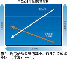 Amkor(亞利桑那州Chandler)的研究顯示,使用較薄的電路層,結合較小尺寸的通孔,可以實現較低的CoO,因為這些深寬比較低的通孔對應制造成本較低(圖5)。
