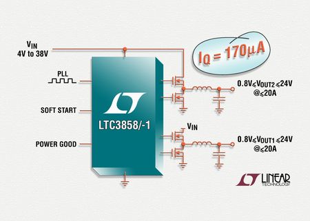 凌力爾特公司 (Linear Technology Corporation) 最新推出低靜態(tài)電流、兩相雙路輸出同步降壓型 DC/DC 控制器 LTC3858/-1。該器件在一個(gè)輸出有效時(shí)僅消耗 170uA 電流,而兩個(gè)輸出都有效時(shí)消耗 300uA。兩個(gè)輸出都關(guān)斷時(shí),LTC3858/-1 僅消耗 8uA,非常適用于汽車和筆記本電腦應(yīng)用。LTC3858/-1 的 4V 至 38V 寬輸入電源范圍能夠針對(duì)負(fù)載突降和冷車發(fā)動(dòng)情況所常見的汽車寬輸入電壓瞬變提供保護(hù)作用,并涵蓋多種電池化學(xué)組成。輸出電流高達(dá) 20A 時(shí),每路輸出均可設(shè)置成 0.8V 至 24V,效率可高達(dá) 95%。LTC3858/-1 適合為導(dǎo)航、音頻、通信、CD/DVD 播放器、磁盤驅(qū)動(dòng)等高性能系統(tǒng)供電。