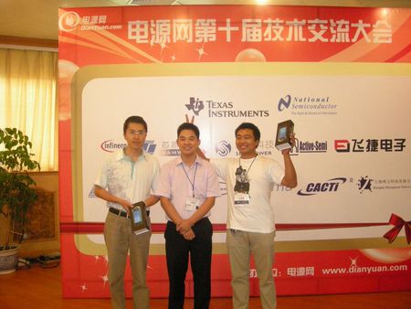 現(xiàn)場(chǎng)抽獎(jiǎng)環(huán)節(jié)中獲獎(jiǎng)工程師與頒獎(jiǎng)嘉賓、電源網(wǎng)總經(jīng)理合影留念