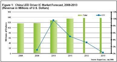 在全球經(jīng)濟和電子產(chǎn)業(yè)沉陷衰退之際,中國LED驅(qū)動器IC 市場2009年將僅增長1%,從2008年的1.153億美元上升到1.165 億美元。但是,2010年增速將會加快到9.6%,規(guī)模將達到1.277億美元。預(yù)計2013 年中國LED市場將達到1.39億美元。