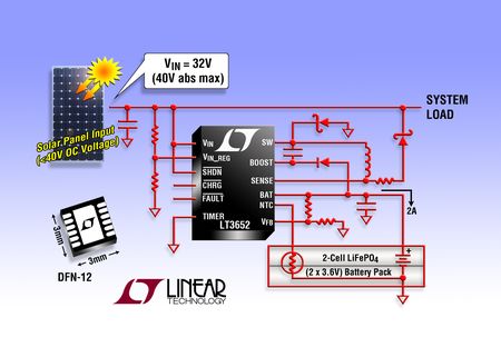 LT3652 可接受4.95V 至 32V 的寬輸入范圍和具有 40V 絕對最大額定值以增加系統裕度。輸入電壓調節環路還允許在采用不良穩壓電源的情況下 (此時,在過流條件下輸入有可能發生崩潰) 實現優化充電。它能夠給多種電池組配置充電,包括單節至三節串聯鋰離子/鋰聚合物電池、單節至四節串聯 LiFePO4 (磷酸鐵鋰) 電池和高達 14.4V 的密封鉛酸 (SLA) 電池。其應用包括太陽能供電型系統、12V 至 24V 汽車設備和電池充電器。