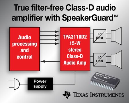 日前,德州儀器 (TI) 宣布推出一款真正的無濾波器 15 W 立體聲模擬輸入 D 類音頻放大器。該器件采用高級電磁干擾抑制技術,無需基于電感器的高成本輸出濾波器,從而可將物料清單 (BOM) 成本降低 50%。該 TPA3110D2 的 SpeakerGuard  保護電路可保護揚聲器免受損壞,有助于降低最終設備用戶退貨幾率與相關支持成本。此外,TPA3110D2 還具有增強性能,是高清電視、媒體擴展基座、數字無線電廣播以及條形音箱 (sound bars) 等消費類音頻應用的理想選擇。如欲了解產品詳情、或獲得評估模塊與樣片,敬請訪問:http://focus.ti.com.cn/cn/docs/prod/folders/print/tpa3110d2.html