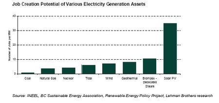 許多研究均顯示,在所有的替代能源中,太陽能在創(chuàng)造工作機會方面的成效最為卓著。據(jù)估計,在生產(chǎn)每MW能源過程中,就可創(chuàng)造出10個就業(yè)機會;而平均在安裝每MW太陽能源的過程中,則估計可創(chuàng)造出33個就業(yè)機會。