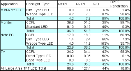 從應用別來看有1千430萬片用在筆記本電腦上,790萬片用在上網本上,60萬片用在電視上,而有10萬片用在桌上型顯示器上。由以下表一顯示2009年第二季 LED背光源面板在各種不同的應用中的滲透率,上網本全數使用LED背光源面板,滲透率為100%;而LED背光源面板占筆記本電腦面板的滲透率為43%,在液晶電視面板的滲透率僅2%,桌上型顯示器面板的滲透率僅0.3%。
