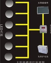 太陽能樓道燈包括有一個安裝在建筑物樓頂的太陽能電池和安裝在各個樓層的照明燈,以及統一安放的蓄電池,充放電控制器。蓄電池與各樓層的照明燈通過導線連接。負載采用LED燈具,并配合聲光控開關工作。