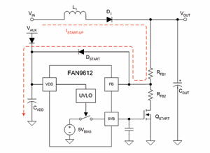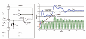 任何電源設計都要優先考慮啟動,PFC轉換器也不例外。對大多數PFC應用而言,穩壓輸出電壓設置點在400V 范圍之內,故只要有任何電壓過沖,尤其是在軟啟動期間,就會對輸出大電容和開關組件造成額外的應力。FAN9612能夠解決與啟動有關的兩大重要問題。第一是能夠在整個啟動程序期間保持閉環軟啟動。圖1所示為FAN9612專有軟啟動電路的功能實現及啟動程序仿真。