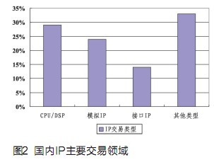 根據對國內IC設計公司的調查,主要的IP應用領域集中在以下幾個范圍:數字音視頻、移動通信和無線通信、汽車電子、信息家電、信息安全和3C融合。根據CSIP的IP需求調查,IP交易領域主要集中在三個方面:一是開發難度較大和應用復雜的高端CPU和DSP;二是標準的接口IP(例如USB接口、PCI Express等);三是模擬IP(如PLL,ADC等)。這三類IP需求占到總需求的一半多。而其他的交易類型如標準的內存模塊,以及一些面向特殊應用的IP,則占據國內需求的三分之一(見圖2)。