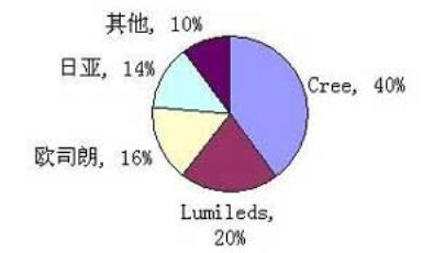 Cree以越40%的份額居榜首,該公司進(jìn)入中國(guó)市場(chǎng)較早,也是唯一在中國(guó)設(shè)有封裝和外延加工車間的國(guó)外LED芯片巨頭。飛利浦LumiLEDs是全球知名的專業(yè)大功率LED制造商,在全球市場(chǎng)占據(jù)很大的份額。日韓臺(tái)的很多芯片企業(yè)則側(cè)重于背光和顯示屏應(yīng)用。