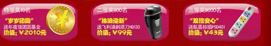 航嘉2010年新年大型寒促已進(jìn)行到了尾聲,北京、廣州、成都、福州、杭州等地紛紛傳來獲得團(tuán)圓禮金的喜訊,但是至今為止,仍有兩項(xiàng)特等獎(jiǎng)仍在等幸運(yùn)的買主,另外豐富的剃須刀、排插等獎(jiǎng)品也還在抽取當(dāng)中。