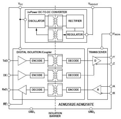 RS-485標準采用平衡式發送,差分式接收的數據收發器來驅動總線。因為RS-485的遠距離、多節點(256個)以及傳輸線成本低的特性,是EIA RS-485稱為工業應用中數據傳輸的首選標準。ADI公司的ADM2582E/ADM2587E器件針對均衡的傳輸線路而設計,符合ANSI/TIA/EIA RS-485-A-98和ISO 8482:1987(E)標準。它采用ADI公司的iCoupler®技術,在單個封裝內集成了一個三通道隔離器、一個三態差分線路驅動器、一個差分輸入接收機和一個isoPower DC/DC轉換器。該器件采用5V或3.3V單電源供電,從而實現了完全隔離的RS-485解決方案。