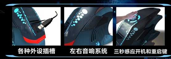 除了在外型上面的設計采用電影中的相關元素,功能上也是極力創造外星球感覺。各種外設插槽滿足用戶多功能的數碼要求,機箱左右均搭配了音響系統,可以享受天籟之音。三稍感應開機和重啟鍵表現出了超強的科技感。