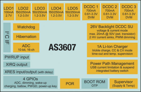 AS3607完全可編程電源管理單元包括:3個(gè)DC-DC降壓轉(zhuǎn)換器和5個(gè)適合RF應(yīng)用的低噪聲LDO穩(wěn)壓器、1個(gè)LED背光驅(qū)動(dòng)器、2個(gè)可編程電流源和1個(gè)強(qiáng)大的鋰電池充電器。3個(gè)降壓轉(zhuǎn)換器每個(gè)都能提供700mA的電流,效率高達(dá)95%,極大地延長(zhǎng)了電池壽命。2 MHz固定開(kāi)關(guān)頻率允許采用微型薄電感,最大限度減小了PCB占位尺寸。