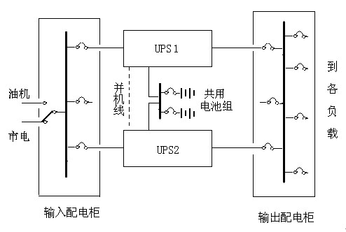 對(duì)于上述需求,按照傳統(tǒng)思路一般會(huì)選用由性能較好的UPS組成的單機(jī)運(yùn)行方案或者雙機(jī)串聯(lián)熱備份方案。這里介紹一種新型的UPS應(yīng)用方案,那就是由臺(tái)達(dá)N+系列UPS組成的雙機(jī)并聯(lián)共享電池組方案。