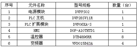 上述表格僅列舉出控制系統主要元器件,此外還包括低壓電器(低壓斷路器、電磁接觸器、電磁繼電器、按鈕、指示燈等)、檢測傳感器(接近開關、行程開關等)、變頻器通訊電纜等,此處均不予贅述。