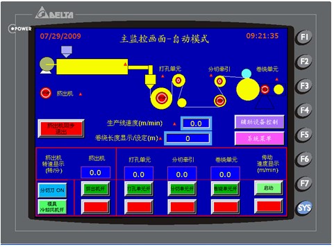 摘要:本文主要介紹了臺達機電產品(觸摸屏、PLC、變頻器、溫控器等)在塑料薄膜生產線上的應用。該控制系統結合臺達HMI、PLC、和變頻器等自動化產品,操作界面友好簡單,實現了設備的技術升級與高效節能。系統運行證明:臺達產品穩定可靠,控制效率高,值得業界同行借鑒和推廣。