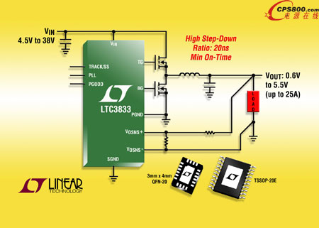LTC3833 提供卓越的總差分調(diào)節(jié)準(zhǔn)確度,而且規(guī)定補(bǔ)償所有誤差源,包括電壓、負(fù)載和差分檢測。LTC3833 的總差分輸出電壓準(zhǔn)確度在 25°C 時為 ±0.25%,在 0ºC 至 85ºC 時為 ±0.67%,而在 -40°C 至 125°C 的整個工作結(jié)溫范圍內(nèi)為 ±1%。LTC3833 采用耐熱增強(qiáng)型 3mm x 4mm QFN-20 封裝或 TSSOP-20E 封裝。千片批購價為每片 2.65 美元。