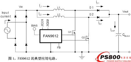 飛兆半導體(Fairchild Semiconductor)推出的臨界導通模式(Boundary-conduction Mode,BCM)交錯式功率因數校正(PFC)控制器FAN9612,專為需要PFC的100W~1000W范圍之AC電源而設計,涵蓋許多目標市場領域,包括消費電子、數字顯示裝置(LCD、PDP、醫療)、照明、臺式電腦、入門級服務器、電信整流器、工業電源系統和太陽能逆變器。這些市場領域的推動力是對于更高效率、更高可靠性、降低總體系統成本和更高水平保護功能的需求。FAN9612的典型應用電路見圖1。