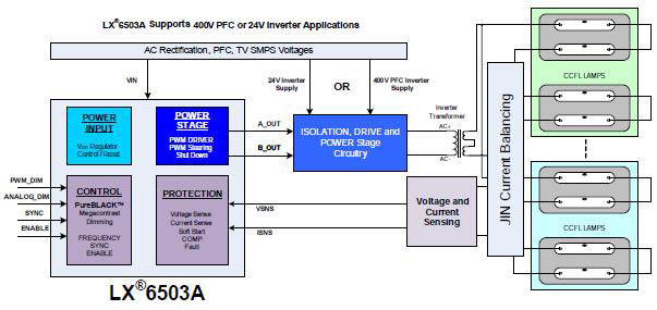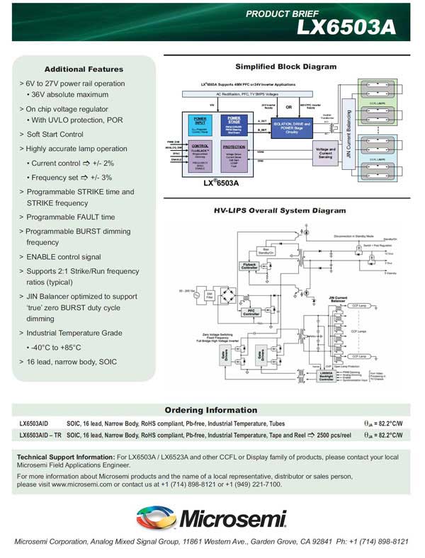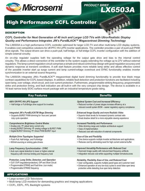 Microsemi在它的CCFL逆變器的控制器產品系列中又添加一個新的產品LX6503A(TM), 該產品使得大屏幕顯示器,其中還包括了那些使用節能的高電壓LCD集成電源(HV-LIPS)拓撲的大屏幕顯示器也都具有了先進的百萬分之一對比度亮度調整的性能。