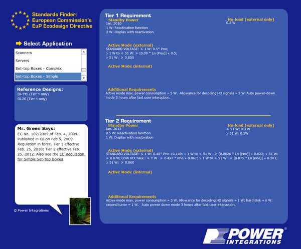 EuP Standards Finder現(xiàn)已正式推出,該工具將隨著生態(tài)設計指令要求的變化和Power Integrations最新參考設計的發(fā)布情況進行及時更新。