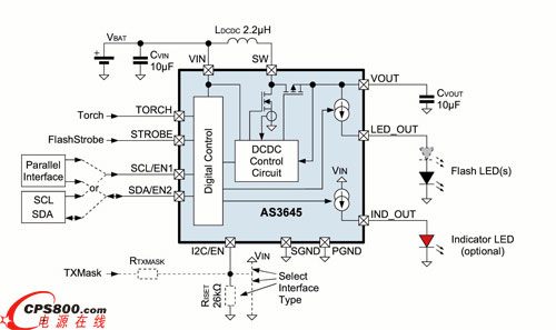 這些特點(diǎn)適合照相手機(jī)閃光燈的需要,尤其是智能手機(jī)和多功能手機(jī)。對(duì)于數(shù)碼相機(jī)、便攜式攝像機(jī)及掌上電腦等其他設(shè)備而言,AS3645閃光燈驅(qū)動(dòng)器也是一個(gè)完美的解決方案。其采用軟啟動(dòng)的高效2 MHz固定頻率DC-DC升壓轉(zhuǎn)換器只需要小型電感器,可以方便地集成到噪聲敏感的RF系統(tǒng)中。高功率LED閃光燈電流源有閃光、火炬和協(xié)助(視頻)光模式。附加的電流源能夠驅(qū)動(dòng)一個(gè)可選LED指示燈。控制可通過并行接口模式實(shí)現(xiàn),以達(dá)到簡(jiǎn)單的集成,或通過I2C接口模式更加全面地控制電流和時(shí)間等所有設(shè)置。接口可通過專用引腳(I2C/EN)選擇。