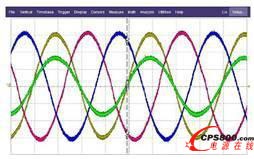 20KVA模塊滿載時,輸入電壓及三相輸入電流波形: THDIA=1.3%, THDIB=1.1%,THDIC=1.2%