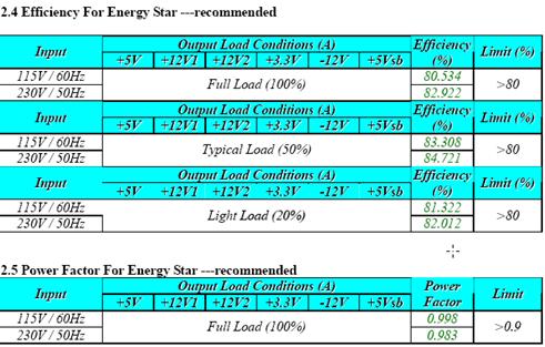 從Intel實驗室的測試對R80的轉換效率結果來看,無論在115V還是在230V的輸入電壓下,其轉換效率均輕松高于80%,特別是在50%的典型負載下,230V輸入時轉換效率接近85%。而功率校準因數則大于標準要求的0.9,其中在115V輸入電壓下,功率校準因數達到了0.998。測試結果令人滿意。(在此僅僅截選了大家較關注的轉換效率測試結果,更多的結果分析不在此贅述)