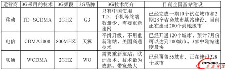 自從2009年中國(guó)3G牌照發(fā)放以后,中國(guó)移動(dòng)、中國(guó)聯(lián)通、中國(guó)電信各運(yùn)營(yíng)商的3G計(jì)劃如火如荼, 三家運(yùn)營(yíng)商的3G制式不同,到2009年底三家運(yùn)營(yíng)商的3G建設(shè)情況如表1: